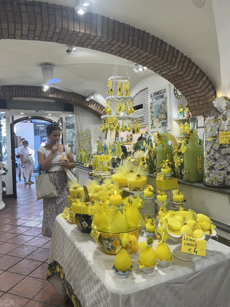 I saw lemon-themed everything in Positano, including the biggest real lemons I have ever crossed paths with – I mean some of these lemons were bigger than my head. I’m a big fan of lemons, and I think the lemon theme makes for a cute decoration. Buying gifts here was so easy because of the endless array of lemon products. Lemon candles, soaps, ceramics, jewelry, limoncello, and actually so much more. You will absolutely find a lemon souvenir here.