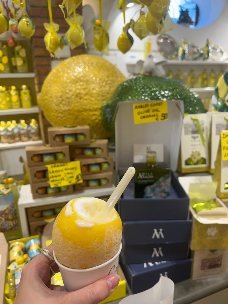 There’s nothing like enjoying lemon sorbet that’s served frozen in a whole lemon peel as you walk the steep streets of Positano. The food here was great, but it tasted just a little bit more special because of the views. Here’s what I ate during my day in Positano – I was there from 11 AM-4 PM:
